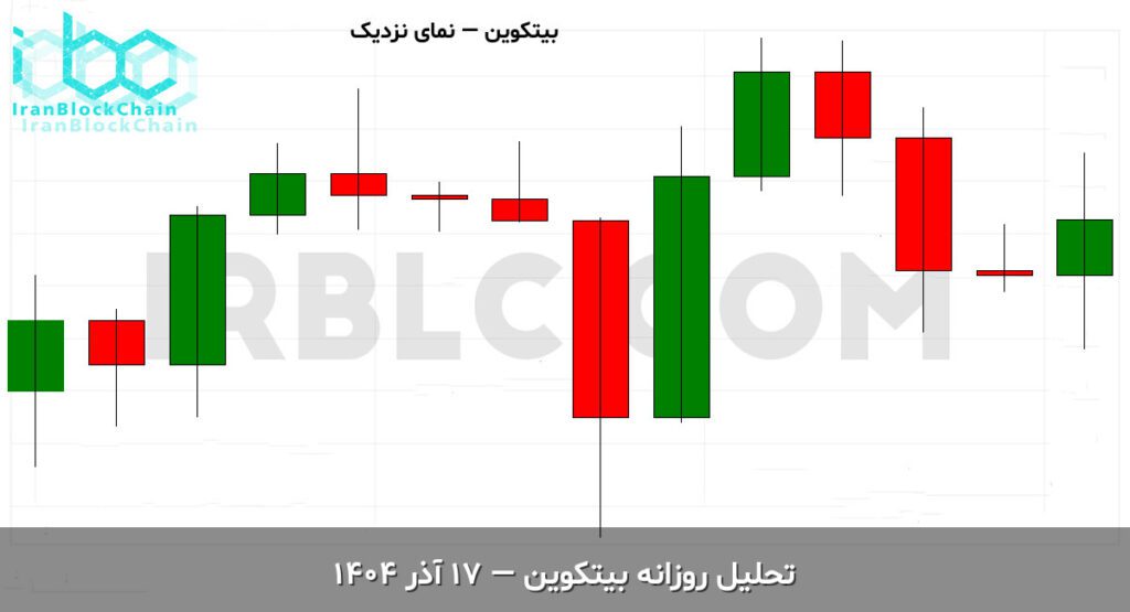 در نمودار نزدیک، مشاهده میشود که قیمت چندین بار در محدوده 88000 تا 91000 حمایت شده و مقاومت در حدود 94000 تا 95000 شکل گرفته است. شکست این محدودهها میتواند جهت حرکت بعدی بازار را مشخص کند. الگوی کندلی غالب، کندلهای دوجی و چکش معکوس است که نشانه تردید در بازار و احتمال تغییر روند کوتاهمدت میباشد.